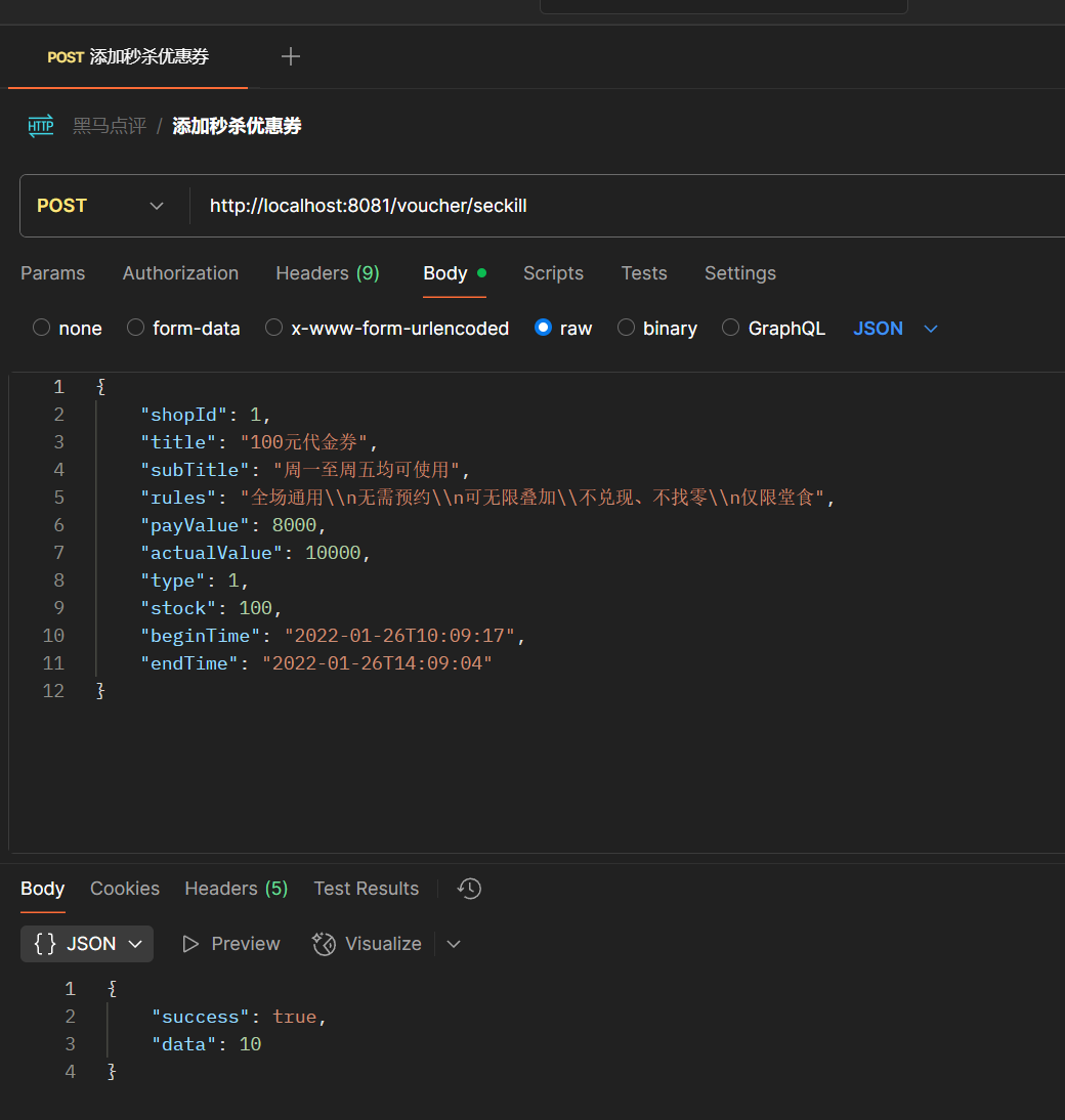 我们首先需要添加一些秒杀优惠券。老师已经写好方法了,/voucher/seckill 路径(注意要给登录拦截器里写上这个放行一下)。我们直接 postman 发送请求就能添加: