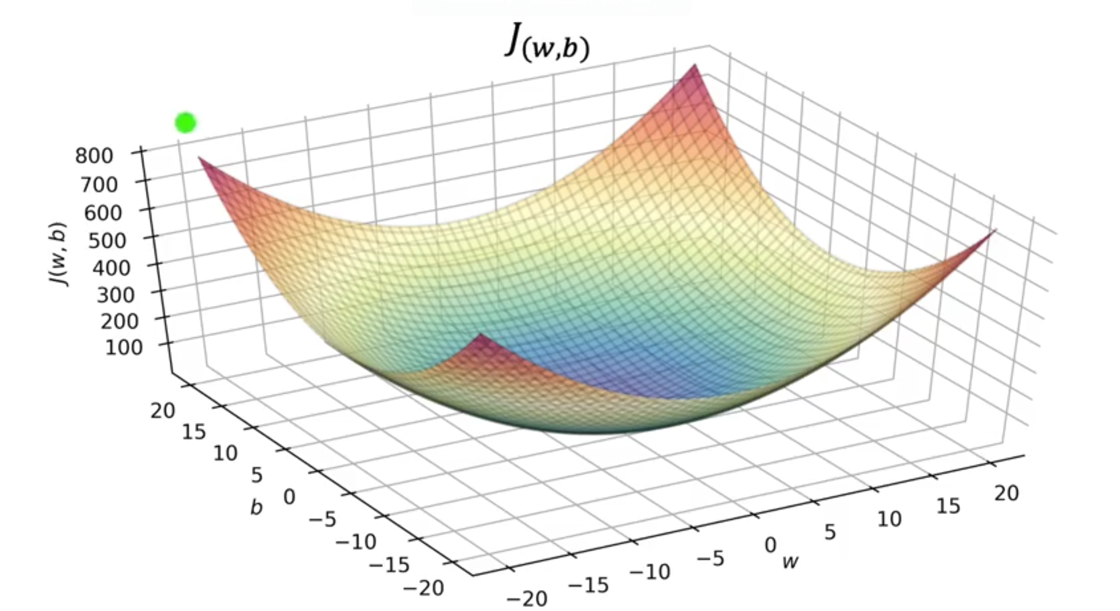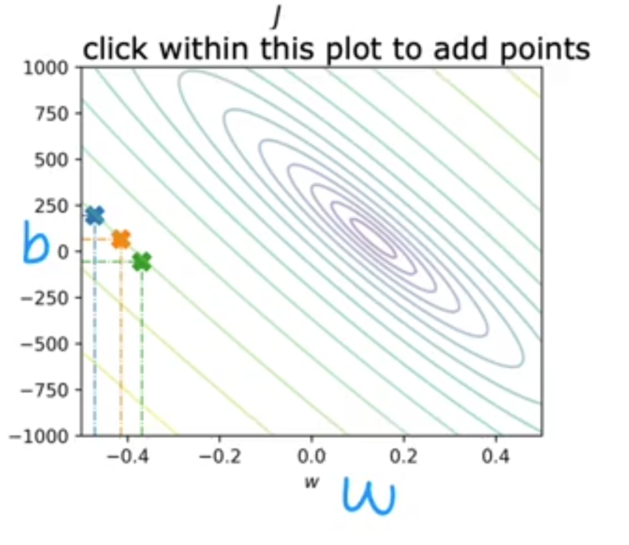 对于这个例子我们要找到的代价函数最小值点就是中间那个凹进去的地方对吧。