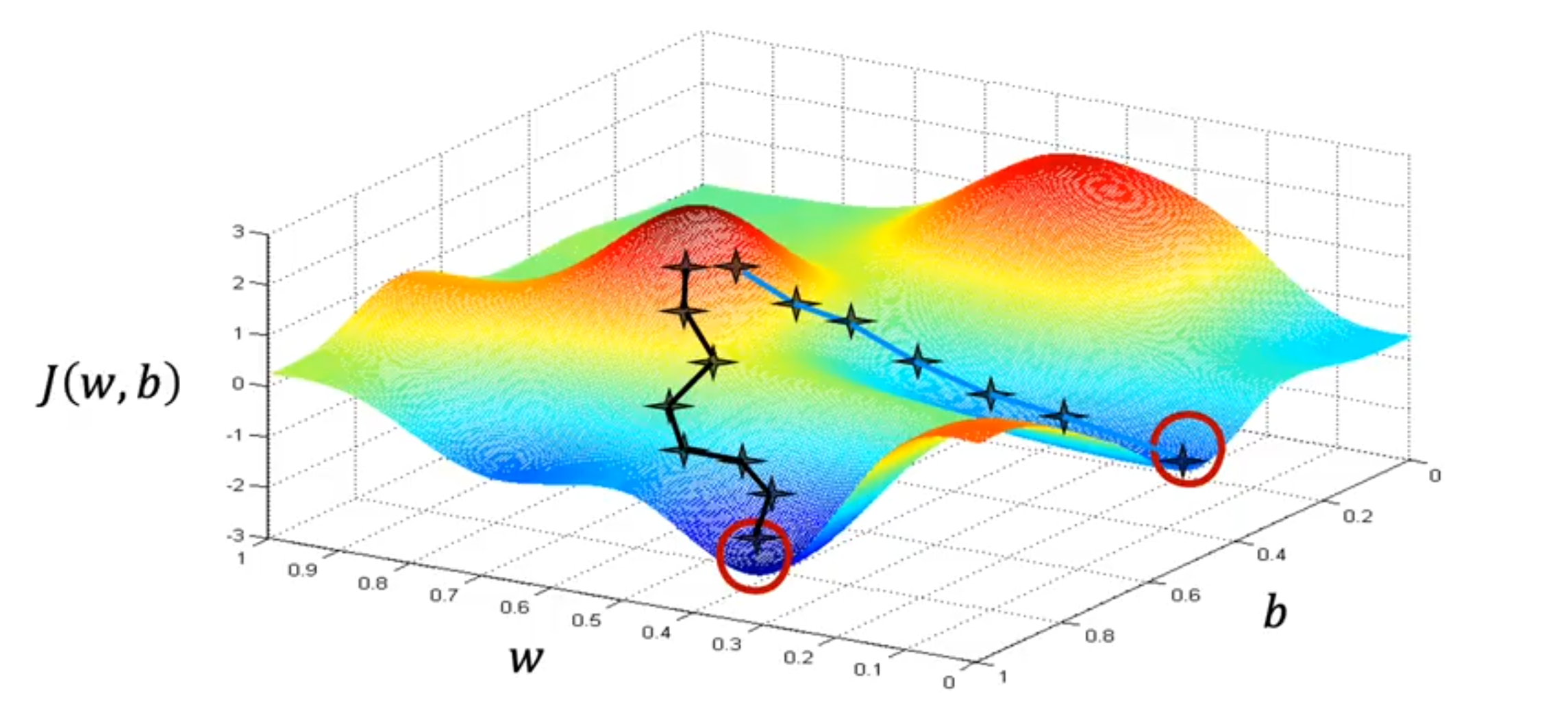另外,一个学习问题可能会有多个局部极小值点。选择不恰当大小的学习率也会导致无法到达最小值。