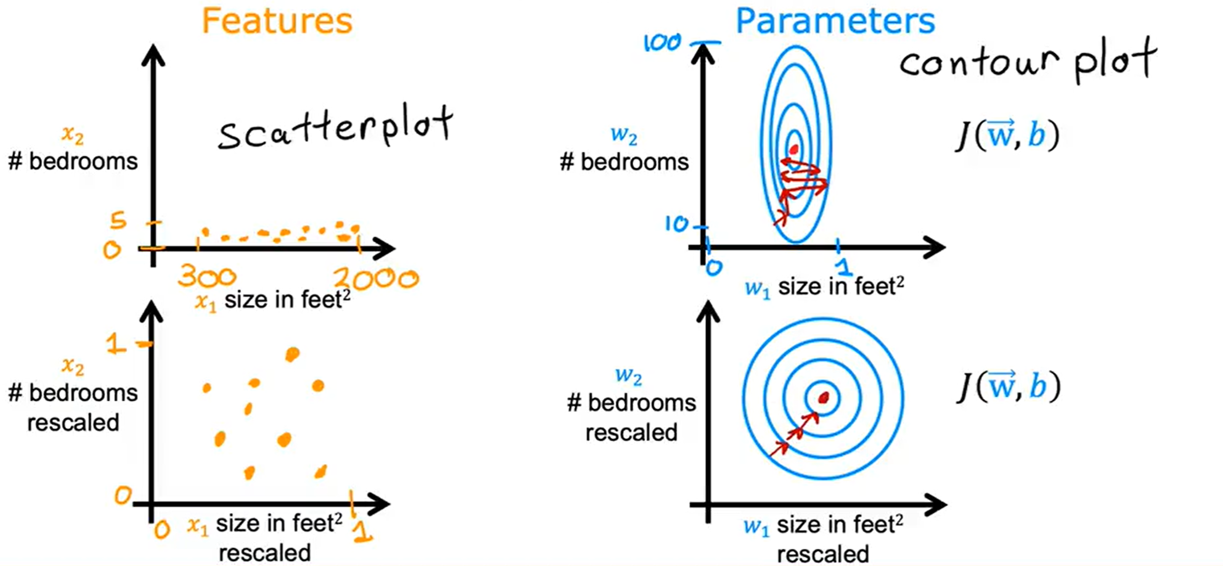 多维度特征尽可能采取范围近似的值,让彼此参数差距不大,否则可能导致梯度下降缓慢。