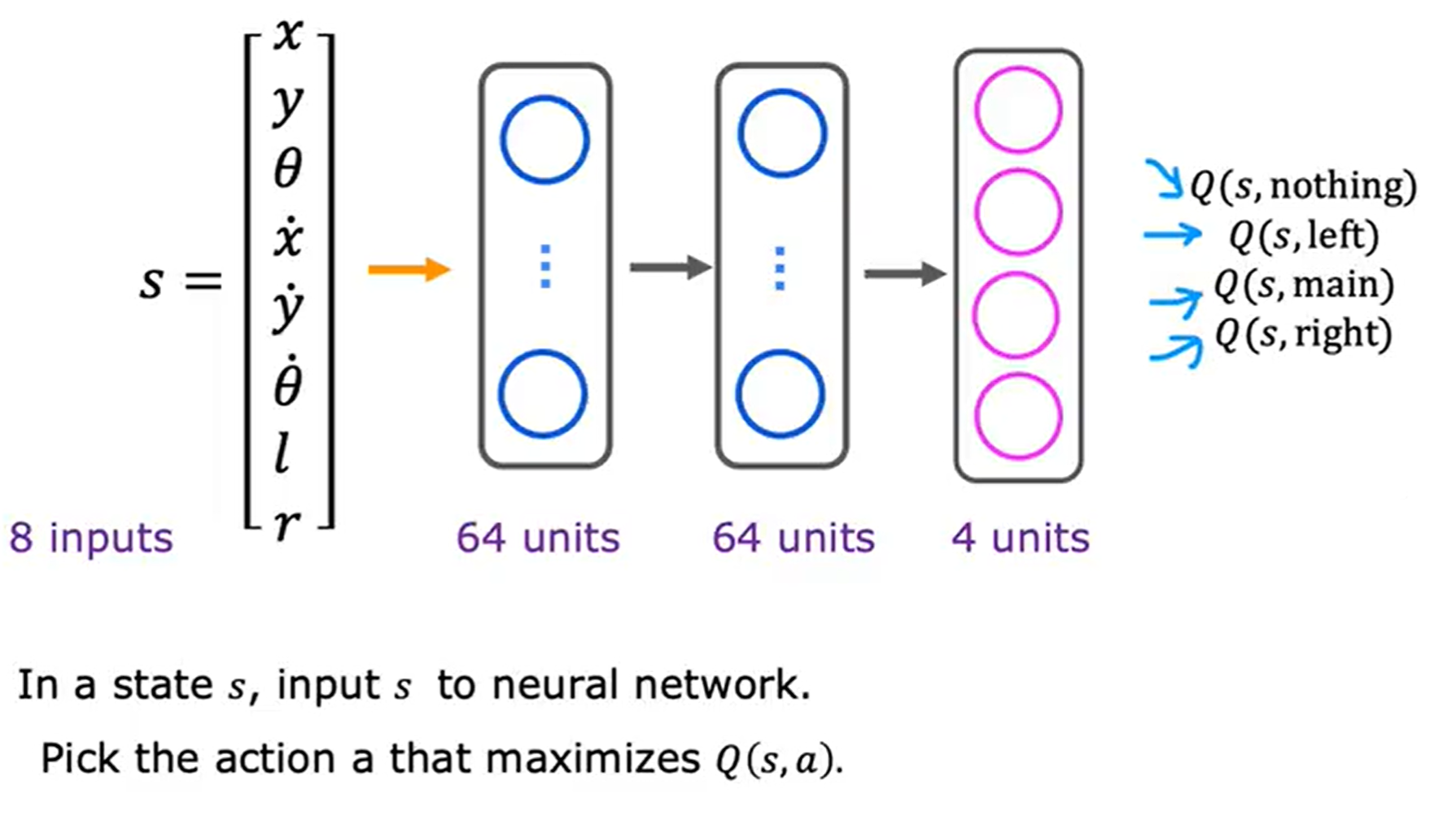 然后在每个时刻比较 Q(s, nothing) Q(s, left) Q(s, main) Q(s, right) 哪个奖励最高。